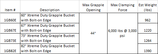 | Item # | Description | Max Grapple Opening | Max Clamping Force | Est Weight (lbs) |
